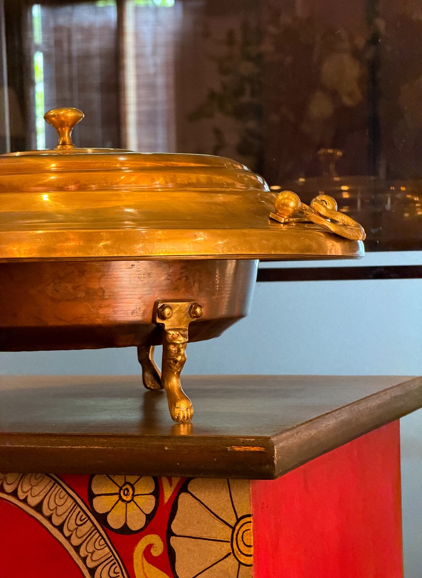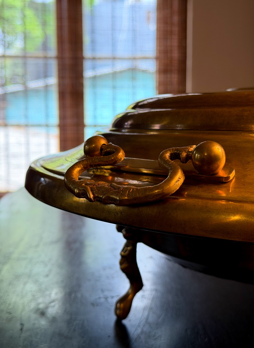 This piece of art stands on 3 bass feet fitted with a bass brazier and a lid adorned with traditional style handles.